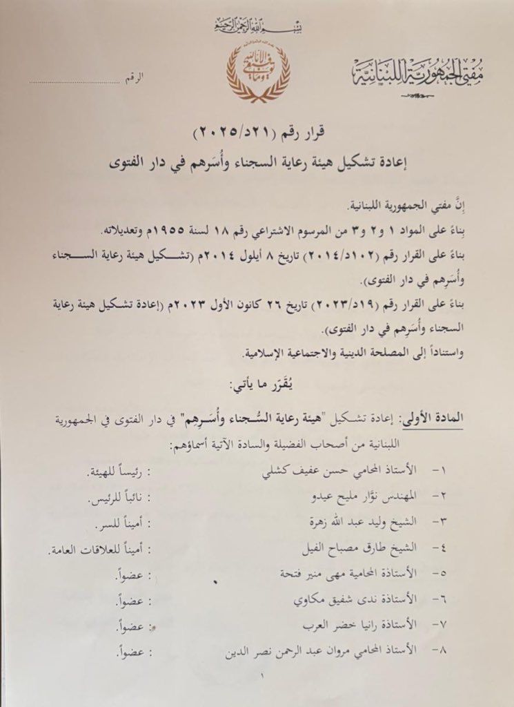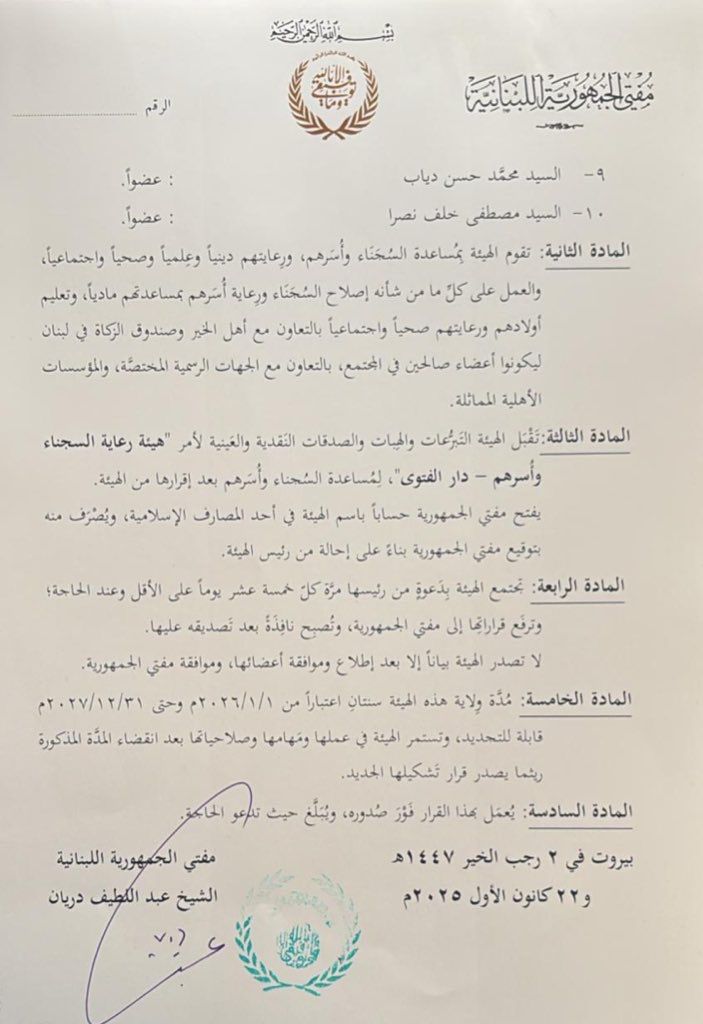Grand Mufti of the Lebanese Republic, Sheikh Abdellatif Deryan, has issued a decree establishing the Committee for the Care of Prisoners and Their Families at Dar al-Fatwa.